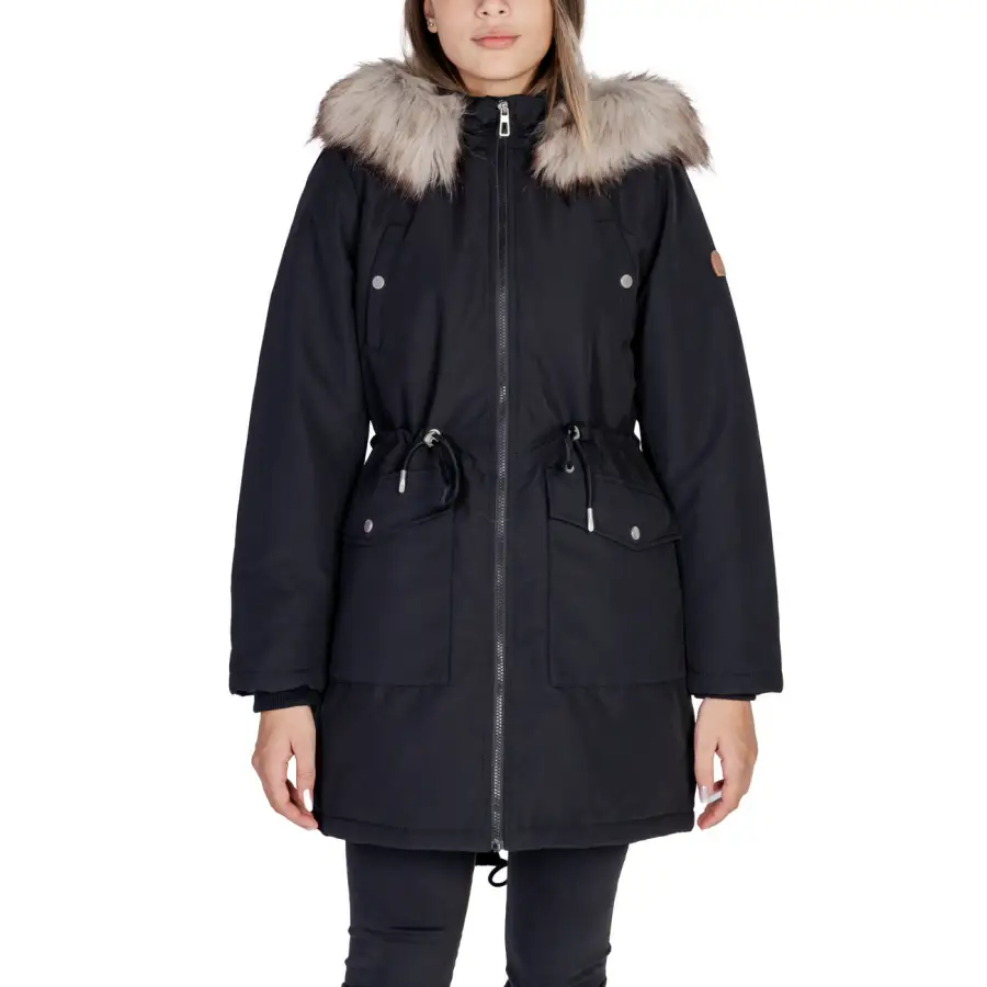 Black Long Hooded Women’s Fall Winter Jacket with Front Pockets and Zip