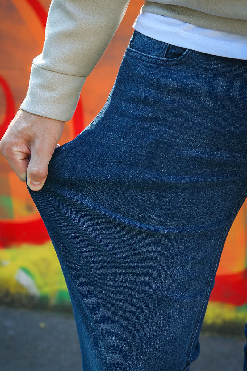 Jack & Jones Jean en couleur Bleu Denim. Disponible en coupe Slim. Fermeture à boutons. Qualité: 70% Coton, 28% Polyester, 2% Élasthanne.