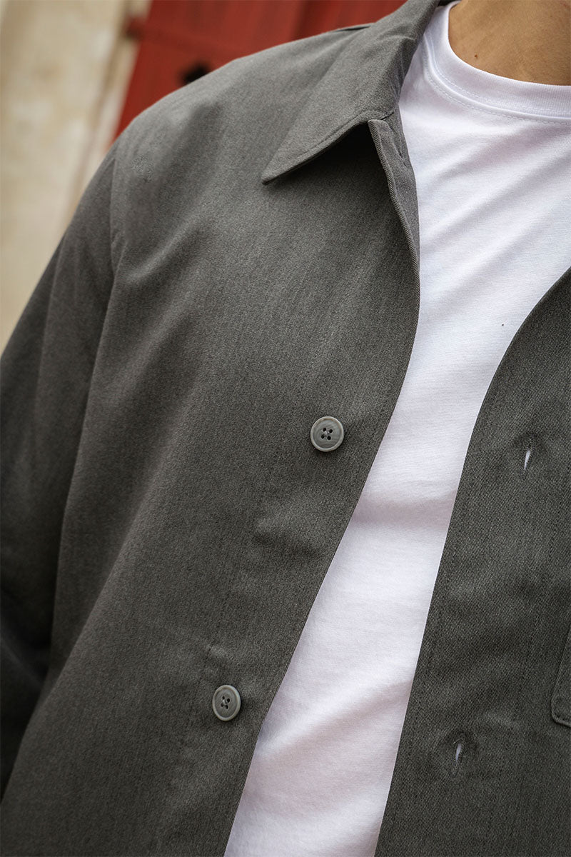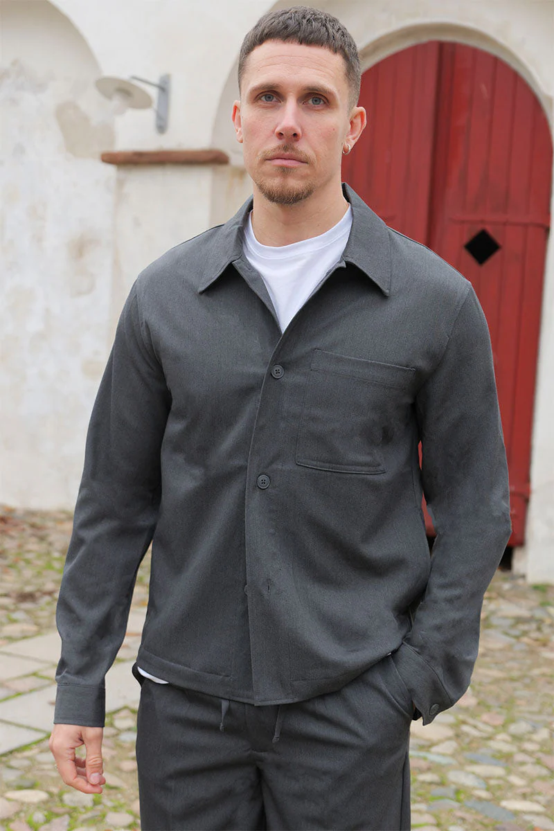 Elle présente une coupe regular confortable et une fermeture à boutons, la rendant à la fois élégante et fonctionnelle. La poitrine est dotée de poches qui ajoutent une touche pratique à ce design moderne. La couleur gris foncé chiné lui confère un style polyvalent et intemporel.